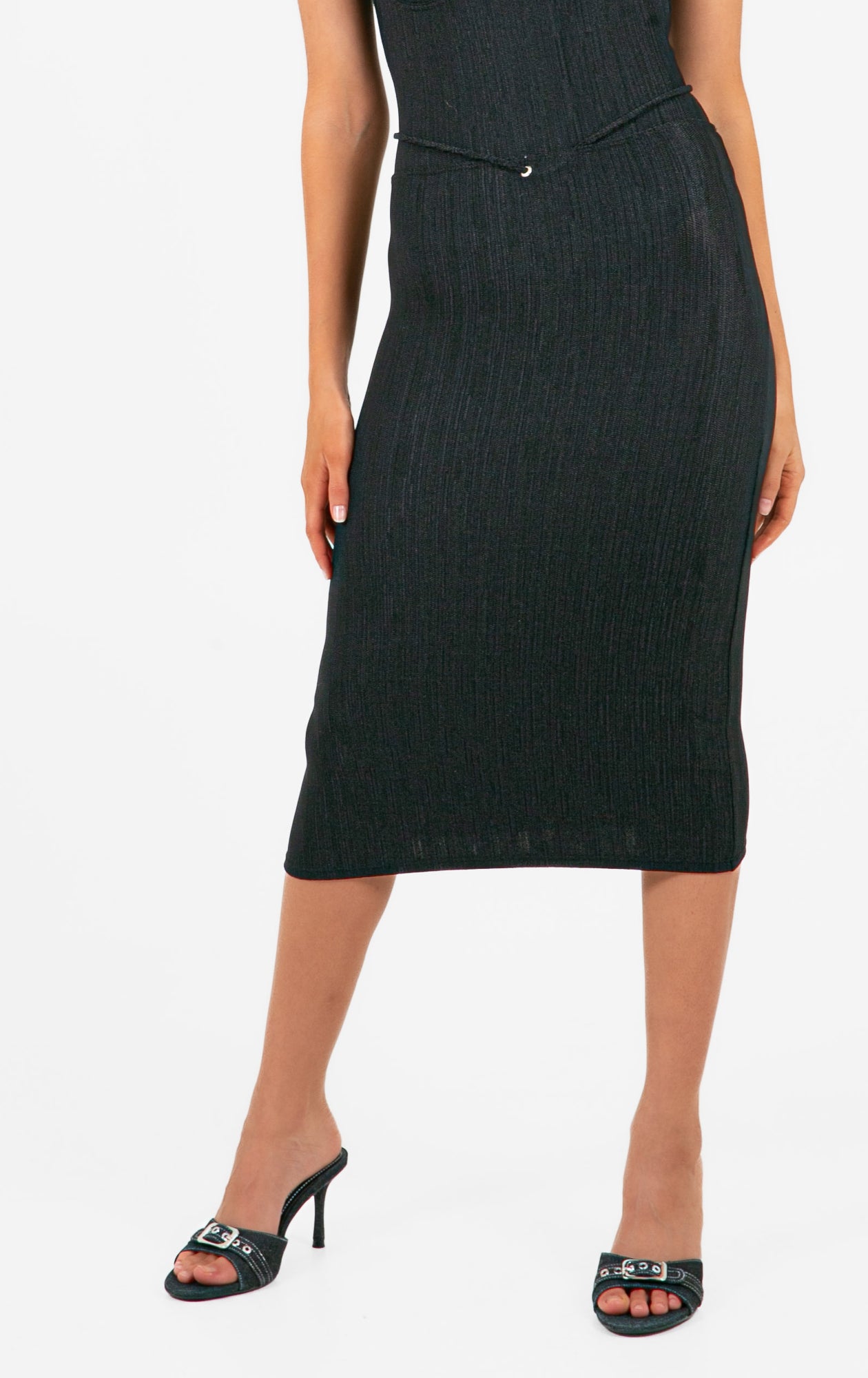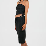 Robe bustier à oeillet en metal et liens à nouer autour du cou. Se porte aussi en jupe.