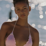 Ce haut de maillot de bain triangle se noue autour du cou. Craquez pour ses volants et ses nœuds en satin.