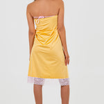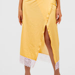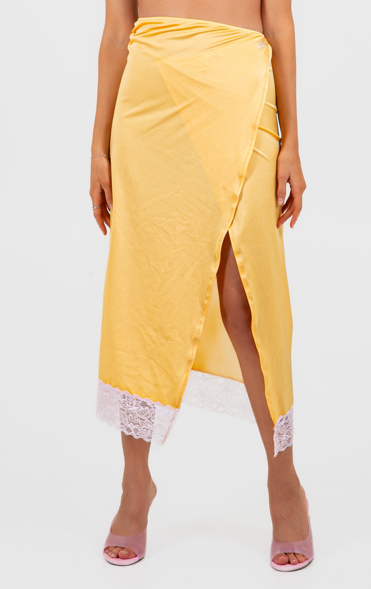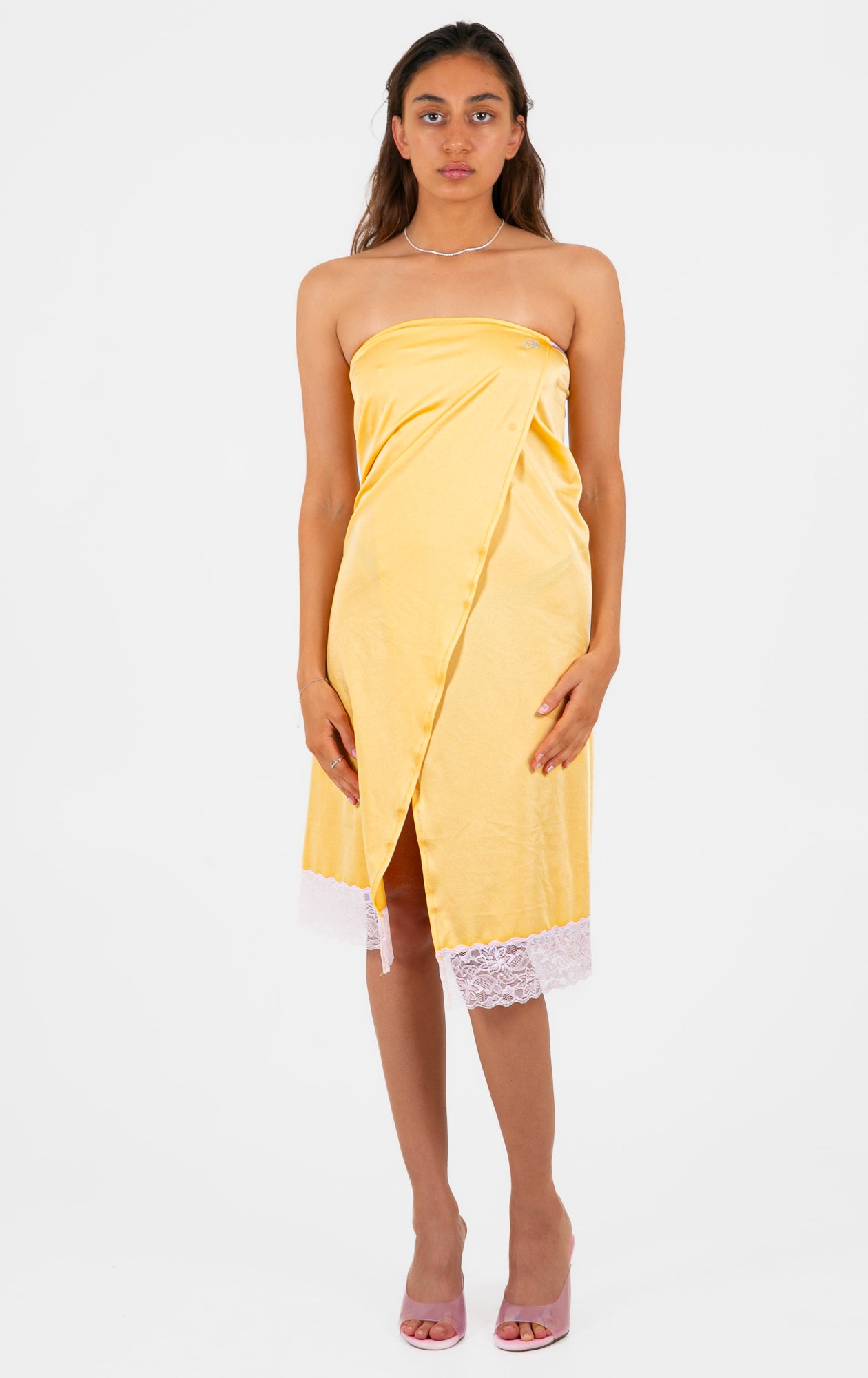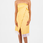 Ce paréo se porte de plusieurs façons. En jupe, noué dans le dos, en robe bustier, ou en robe avec les liens croisées autour du cou. Le bas du paréo est en dentelle et le logo "P" est en strass.