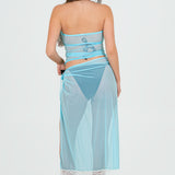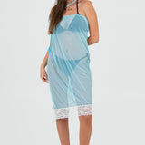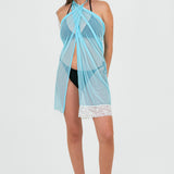 Ce paréo se porte de plusieurs façons. En jupe, noué dans le dos, en robe bustier, ou en robe avec les liens croisées autour du cou. Le bas du paréo est en dentelle upcyclé.