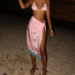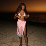 Ce paréo se porte de plusieurs façons. En jupe, noué dans le dos, en robe bustier, ou en robe avec les liens croisées autour du cou. Le bas du paréo est en dentelle et le logo «P» en strass.