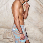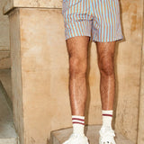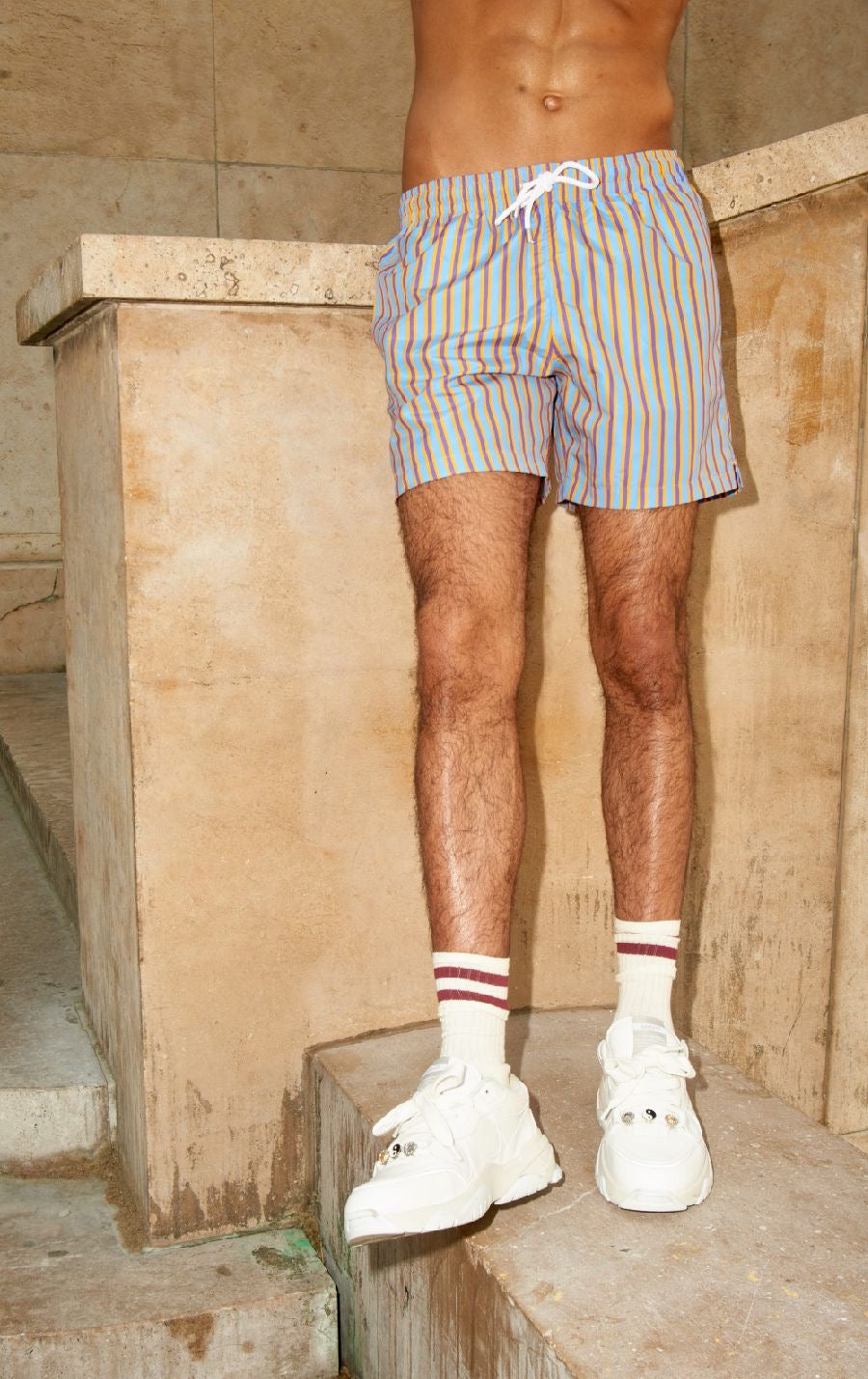 Le short de bain pour homme à rayures est celui qu'il vous faut pour cet été. Il est resserré à la taille grâce à sa ficelle et est très agréable à porter. Il contient une poche arrière zippée, un filet intérieur, et est de longueur moyenne. Conçu de manière éco-responsable et fabriqué en Italie.