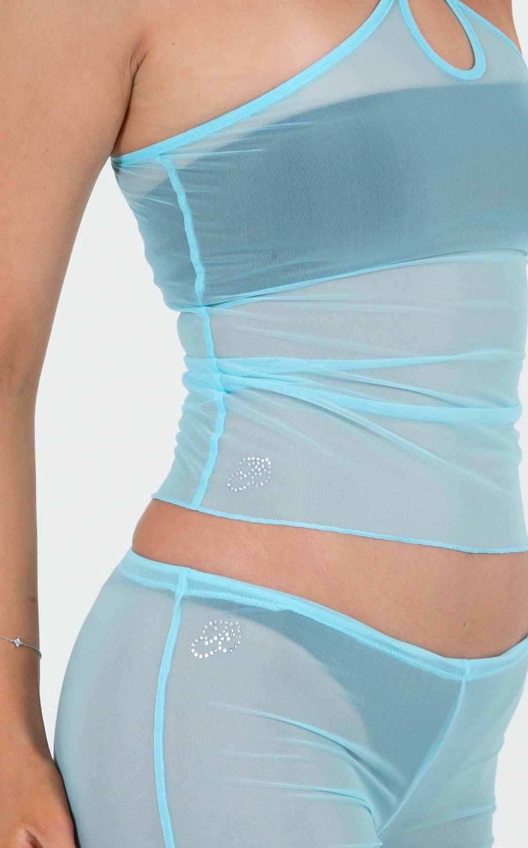 Faites-vous remarquer cet été avec notre Shorty, disponible en deux coloris audacieux et éblouissants. Ce shorty transparent taille basse a des liens coulissants à nouer sur les côtés et arbore une coupe moulante. Craquez pour son logo "P" en strass.