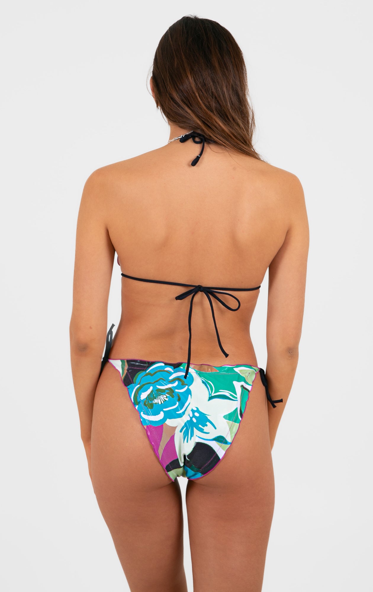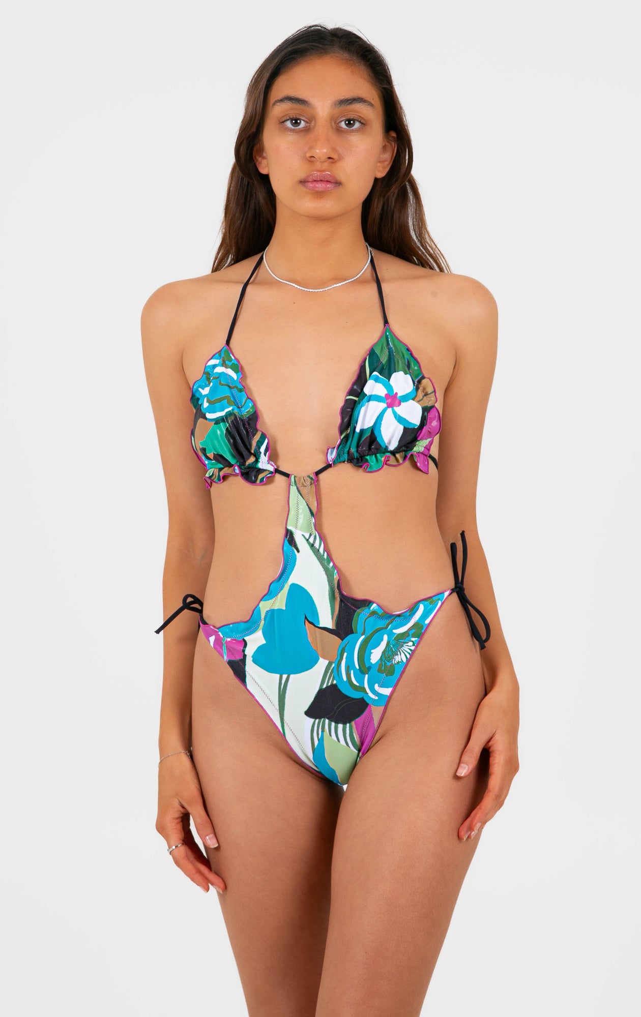 Ce maillot de bain une pièce en triangle se noue autour du cou ainsi que sur les hanches et dans le dos. Craquez pour ses volants surpiqués.