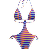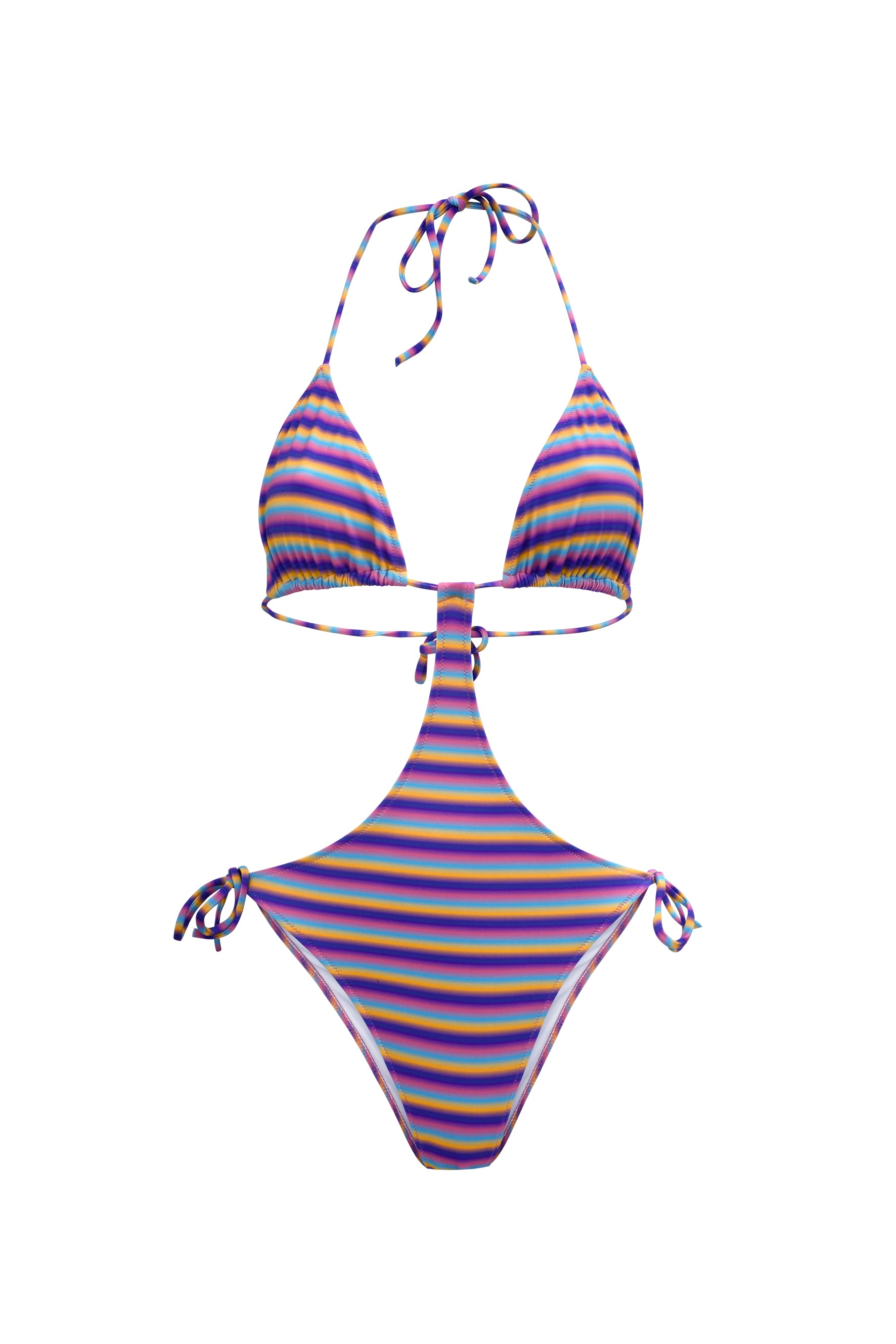 Ce maillot de bain une pièce en triangle se noue autour du cou ainsi que sur les hanches et dans le dos.